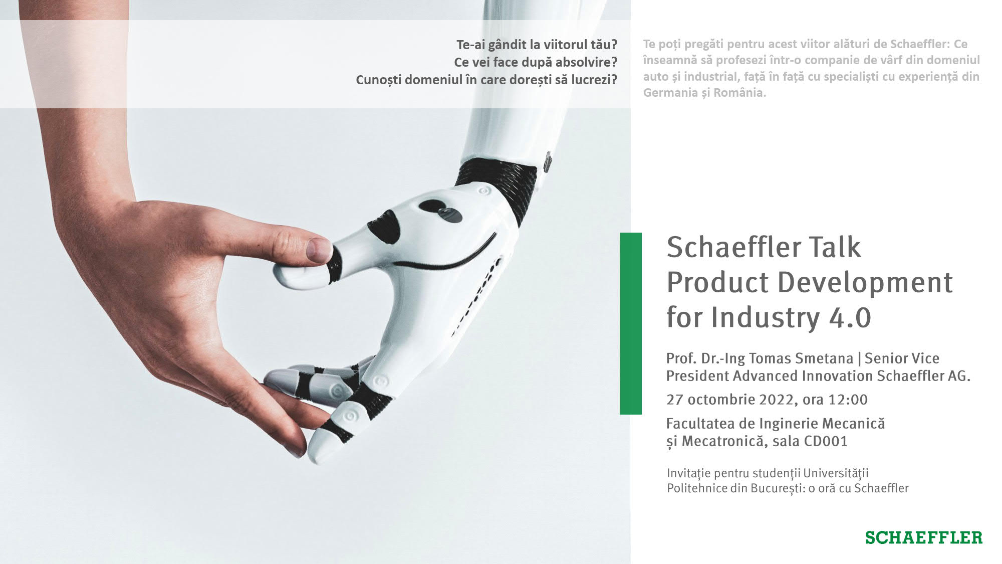 Este o oportunitate extraordinară pentru dumneavoastra să aflati direct de la specialiștii Schaeffler cât mai multe informații despre provocările și oportunitățile de inovare în dezvoltarea sistemelor mecatronice, dar și cele mai noi tendințe în Robotică.