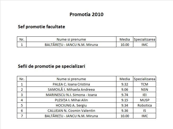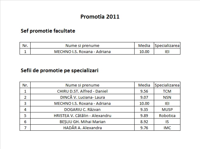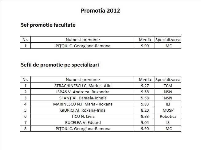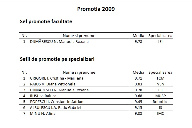 | Promotia 2012 | Promotia 2011 | Promotia 2010 | Promotia 2009 |